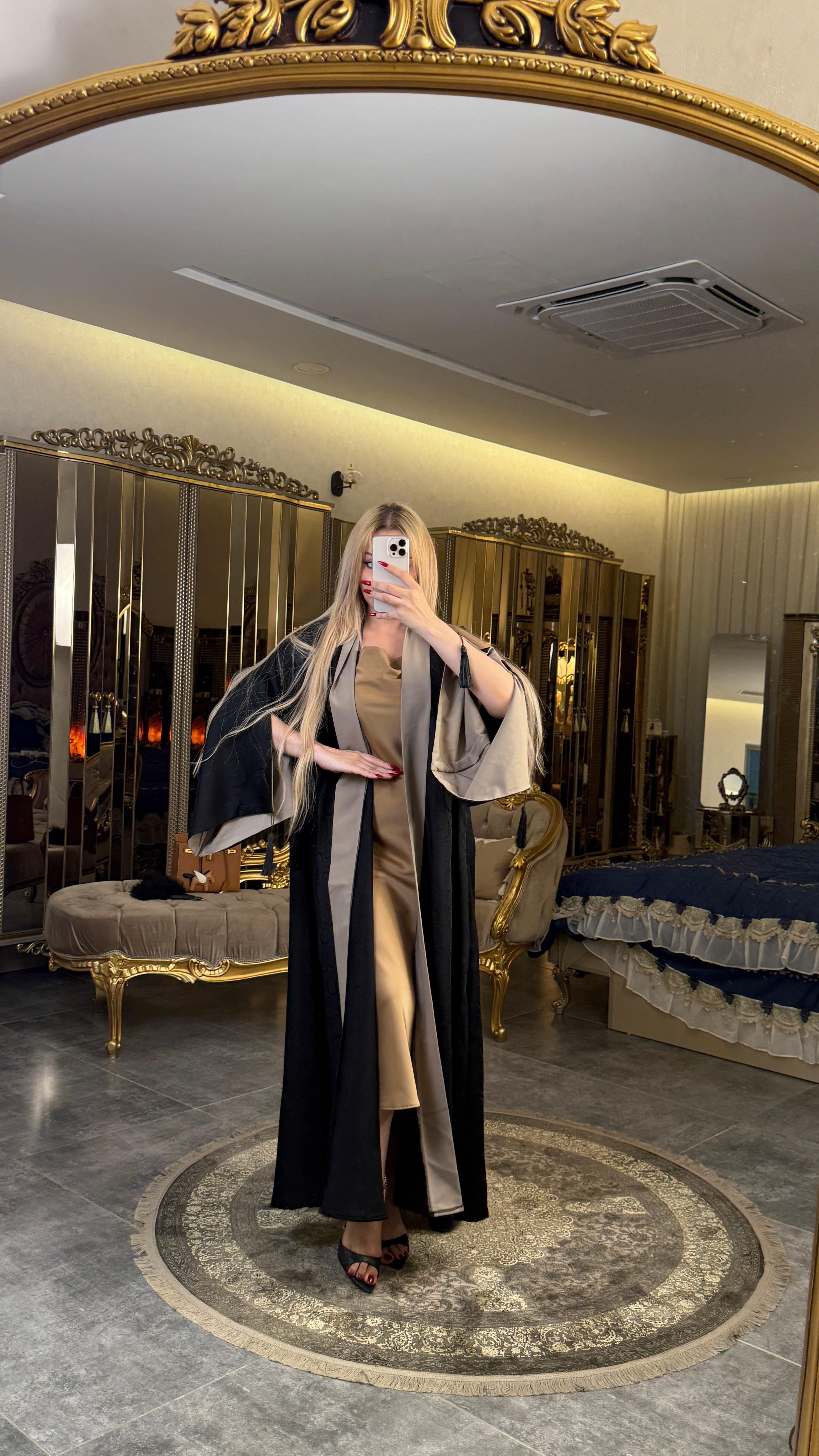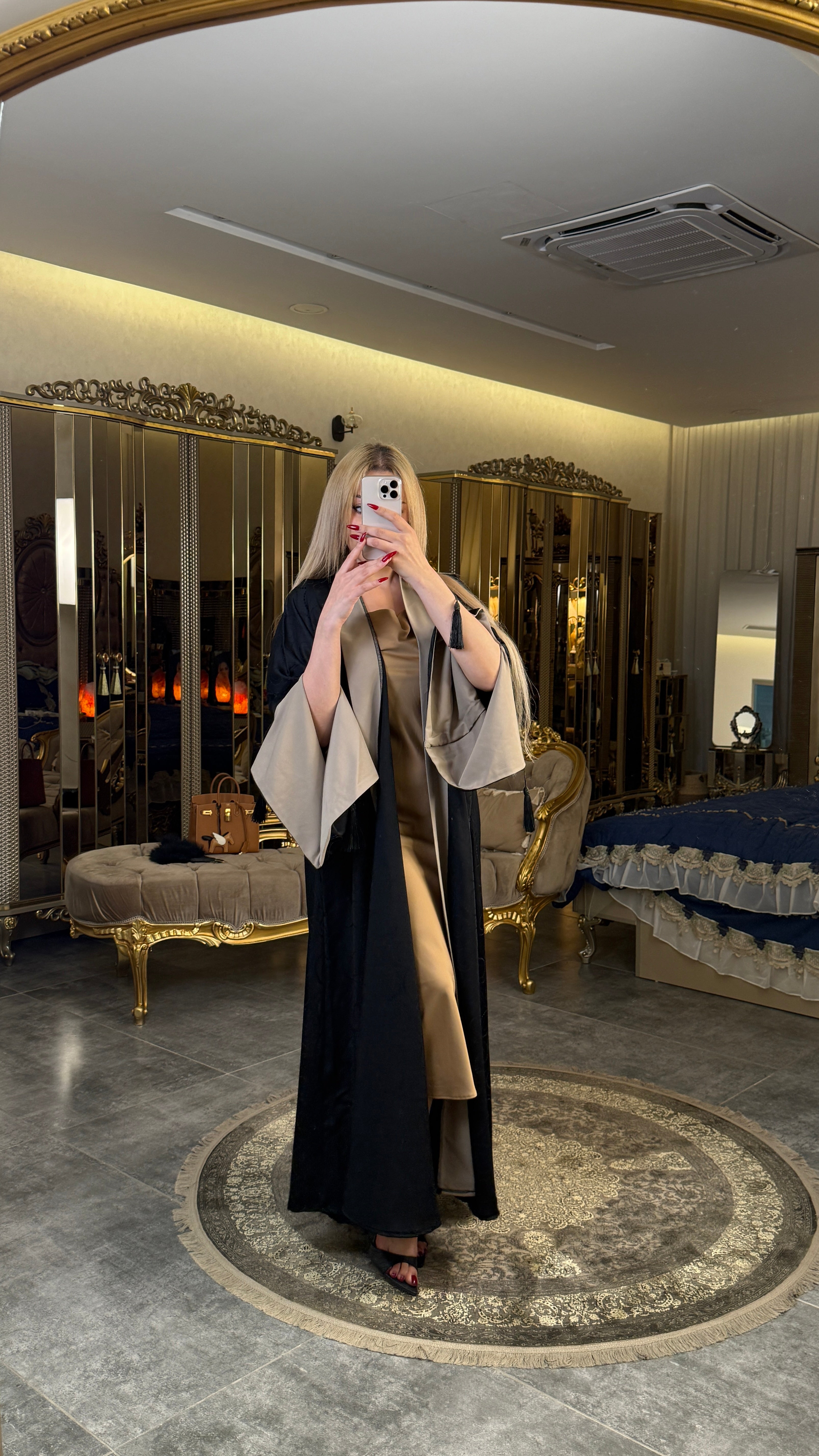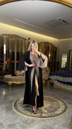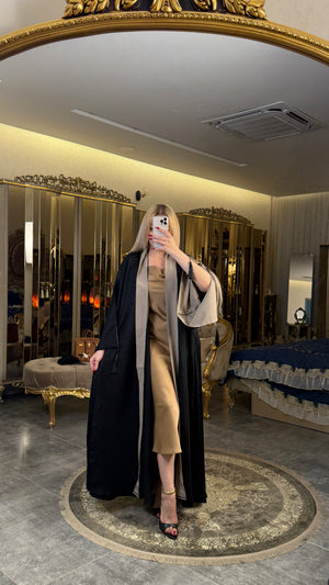 بشت أسود أنيق منقوش بتفاصيل راقية مع تطعيمات باللون البيج، تصميم يجمع بين الفخامة والكلاسيكية ليمنحك حضوراً مميزاً في كل مناسبة